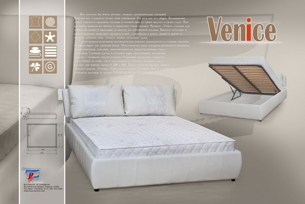 Вам хотелось бы иметь уютную, модную, романтическую спальню?  Конечно же, у каждого из нас свои требования. Но есть кое-что общее. Большинство людей стремится оформить спальню в соответствии со своим вкусом, в своем стиле. Как раз выбор кровати во многом и определяет стиль спальни. Кровать «Venice» создана для любителей провести выходные не выходя из собственной спальни. Высокое изголовье и мягкие подушки позволяют посидеть в ней  с ноутбуком в руках, провести время за чтением любимых книг, поспать лишних несколько часов.  У этой кровати встроенная ортопедическая решетка поднимается со стороны изножья, открывая ящик для хранения белья. Металлическая рама оснащена высококачественными ортопедическими ламелями, выполненными из твердолиственных пород древесины. Удобный доступ в бельевой ящик обеспечивают механизмы подъема с газовыми амортизаторами. Одинаково прекрасно смотрится как в обивке из кожи, так и кожзаменителя. Размер спального места (размер при выборе матраса) 200 х 160. Может комплектоваться любым матрасом фирмы «Сончик».